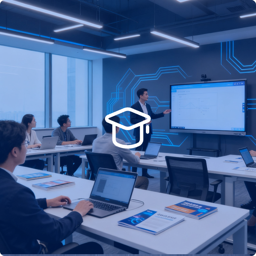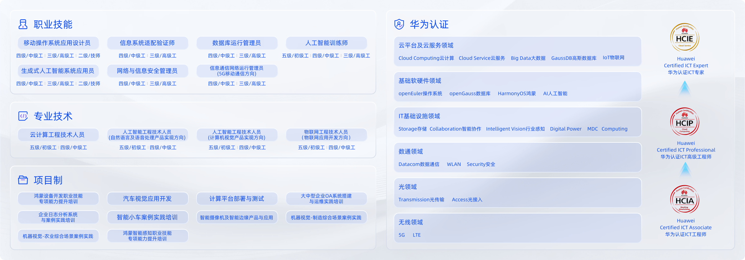 依托华为领先ICT技术,围绕产业要素人才及集团自有业务规划,全链数智人才发展创新基地配置了大实训室,12类实训场景,基于华为Talent实训平台,提供课程资源(包含PPT教材、视频、实验手册、案例、试题等)及实训资源(包含模拟器、真实设备、云原生、实验指导等),支持包含人工智能职业技能培训、华为认证标准项目40+以及相应定制化培训项目。